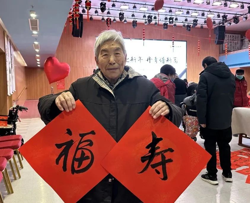 除了書畫展活動(dòng),養(yǎng)護(hù)中心工作人員還精心組織策劃了寫福字送對(duì)聯(lián)交流筆會(huì)活動(dòng)。現(xiàn)場氣氛熱烈,熱愛書法的長輩們歡聚一堂,用一幅幅書法墨寶傳遞濃濃的情誼和美好的祝福。書桌上紅紙鋪展、墨香氤氳,長輩們提筆揮毫、落墨成書,將滿滿的節(jié)日祝福傾注于紅紙之上,一幅幅寓意吉祥、字體遒勁的春聯(lián)躍然而出,字里行間寄予著對(duì)2024年生活的美好祈愿。