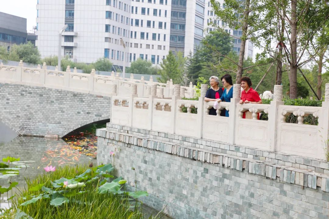 一條橫貫東西的景觀河既形成了風景宜人的景觀,又提高了周邊的空氣濕度,改善了園區的生態環境。到了夏日,景觀河中的荷花競相盛放、嬌艷欲滴,清澈的河水中一群群錦鯉歡快地嬉鬧,河上矗立著精美的拱形石橋,是我們清晨觀賞日出、傍晚欣賞晚霞和觀看噴泉的絕佳去處。大家平時在園區內閑庭信步,在亭閣內唱歌、跳舞,悠閑自在,在樹蔭下聊過去、談未來,生活很是愜意!