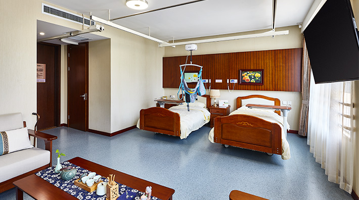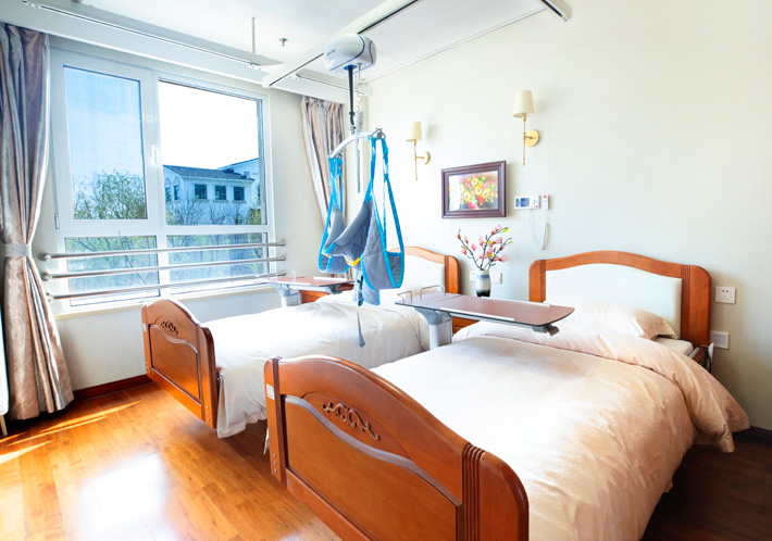 失能型和失智型養老社區設置的養老居所有:52㎡VIP套間、52/55㎡豪華雙人間、31—40㎡普通雙人間,豪華舒適,房間設有吸氧、吸痰裝置。每層均設有護士站,醫護人員24小時值班,為長者提供優質的護理服務。配備的天軌移位系統,在護理員協助和陪同下,為半非自理長者站立、行走、康復、洗浴、如廁、室外活動和生活照料等提供保障。智能床墊系統隨時監測長者的各項身體指標,極大降低了高危長者發生意外的風險。