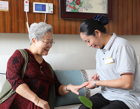 根據(jù)長者身體狀況,養(yǎng)護中心專業(yè)的護理團隊,為長者提供不同等級的規(guī)范化護理服務。經(jīng)過專業(yè)培訓的護理人員,為長者提供整理衣物、床鋪,洗浴、洗腳、修剪指甲、幫助室內(nèi)外活動、沐浴陽光、晨晚間護理和各類生活照料等近百項服務;根據(jù)照護級別提供服侍飲食、穿衣、叩背、翻身、如廁、沐浴等細節(jié)化的個人專享服務。保潔員定期上門進行居室保潔、清洗床上用品和衣物等。配備的營養(yǎng)師,定期上門指導營養(yǎng)配餐,制定健康飲食方案。社工師定期上門對長者進行精神慰藉、靈性關懷,帶動活動和解決矛盾等。
